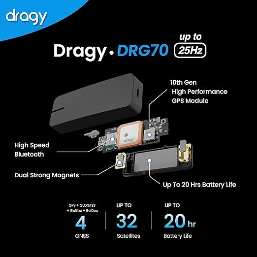 Wordt geleverd met een gebruiksvriendelijke app die gratis kan worden gedownload voor iOS en Android, om uw GPS-snelheid en -prestaties te bekijken en aangepaste meetparameters toe te voegen. Dragy gebruikt krachtige 10Hz GPS en GLONASS om de prestaties van uw voertuig binnen 1/100 seconde nauwkeurig te meten. Het heeft een ingebouwde batterij die tot tien uur meegaat.